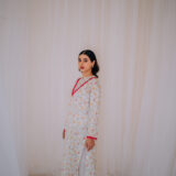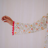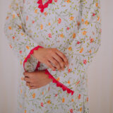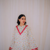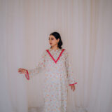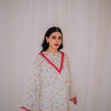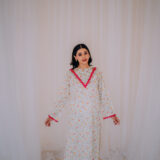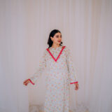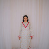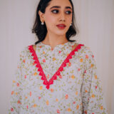 The staple off-white outfit for this season is this long-length shirt with lace and button details on neckline, paired with straight dyed pants and dupatta perfected with matching lace all over the borders.
